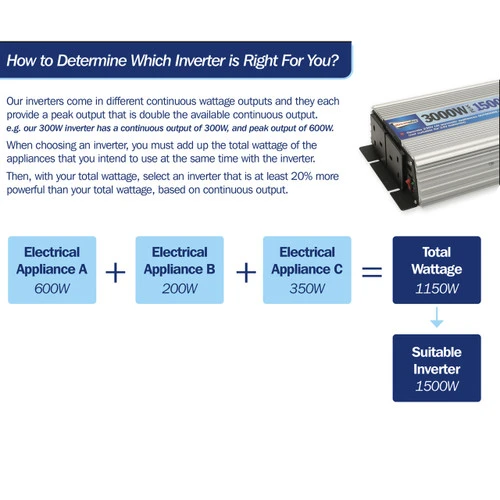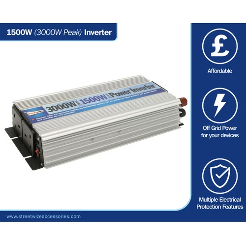 For drivers, caravaners, campers and tradespeople who need access to a power supply when they are in a remote area, on site or where there is restricted access to a power supply. This 1500W (3000W peak) modified sine wave inverter safely converts the vehicle’s 12V DC battery to a 230V AC power supply.