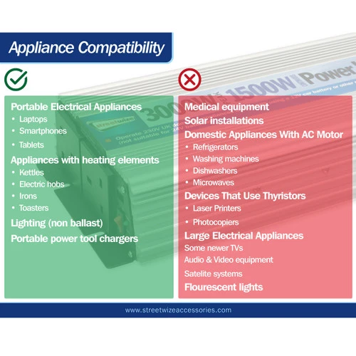 • powering laptops • phone chargers • tablets & games consoles • Lighting (non ballast) • Charging batteries in cordless power tools * Low wattage appliances with heat element such kettle or toaster * Water pump