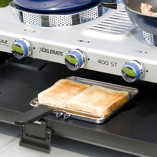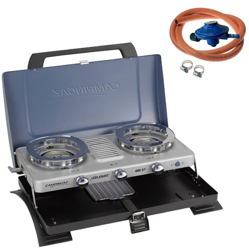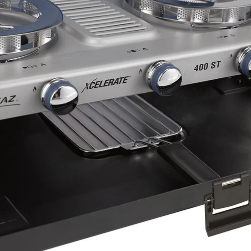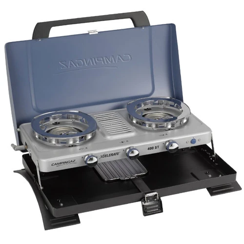 The Campingaz 400ST. The powerful Xcelerate technology ensures high performance and fast boil time when cooking outdoors, especially in windy conditions. Featuring two Xcelerate burners and an additional infrared grill that is perfect for toasting. Packing away is made easy – simply fold down the 400ST and the integrated sturdy lid protects the appliance and carry handle makes it ideal for transportation.