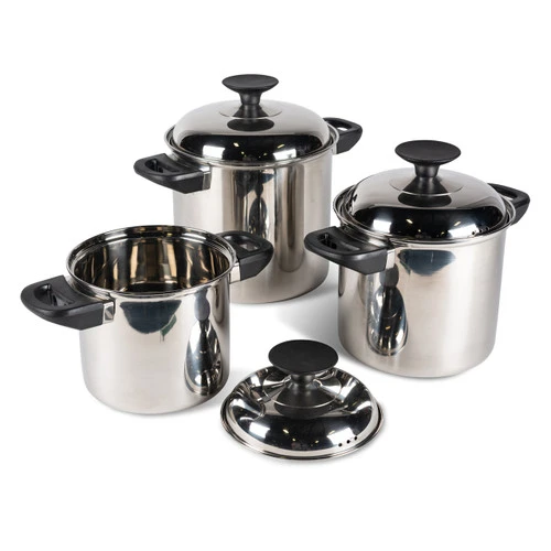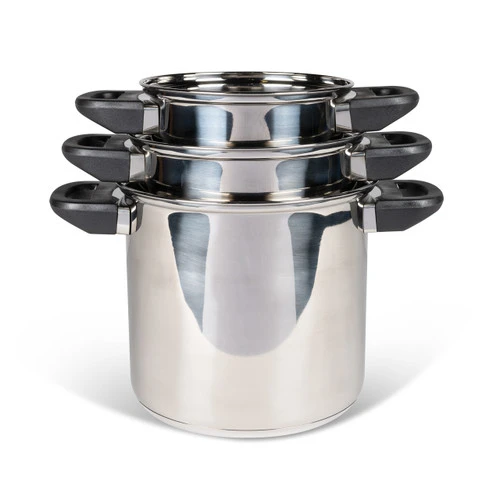 Lightweight and strong with its high-quality stainless-steel construction, the Space Saver offers space saving design where this three-pan cook set nests together for compact storage.