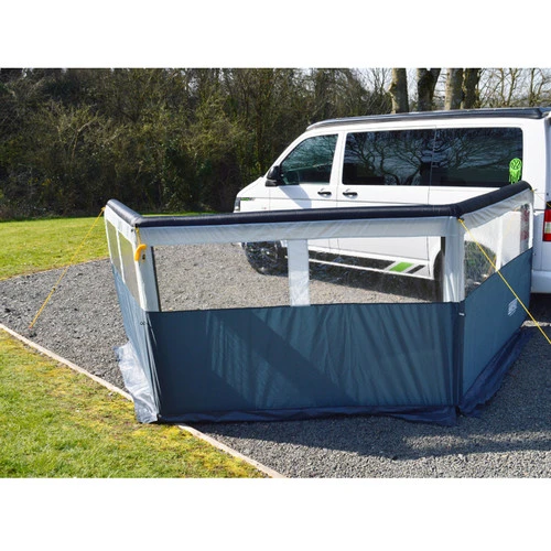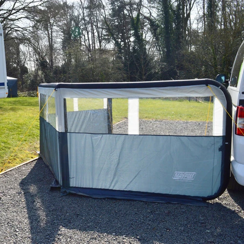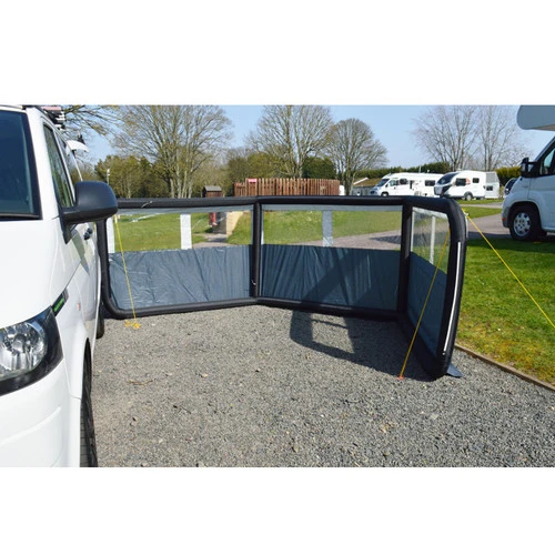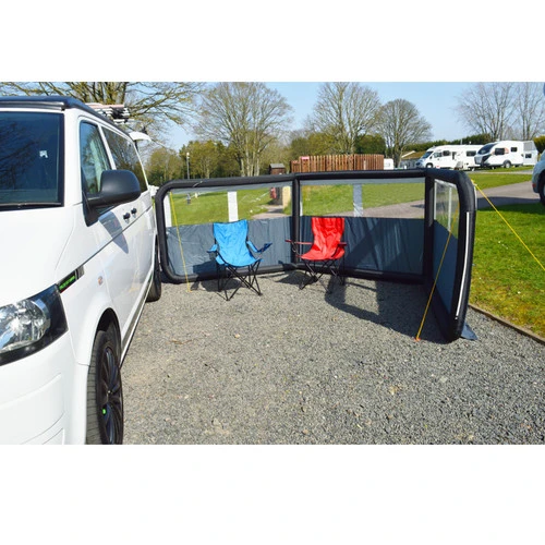 Maypole’s 3 panel single point inflation windbreak provides privacy and protection from the wind. The sturdy airframe is quick and easy to inflate via a single point air tube. The windbreak includes removable window covers for added privacy, and midway pegging points to keep your pets safely inside. Kadar strips on either end allow for caravan awning rail attachment, giving you extra stability. Hand pump, guy ropes, pegs and a compact carry bag are all included.