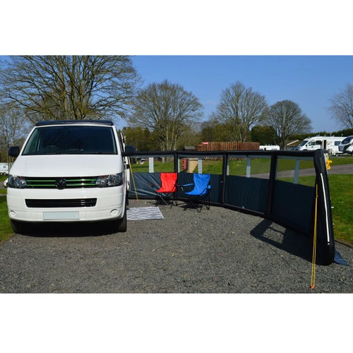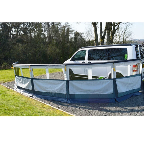 Maypole’s 5 panel single point inflation windbreak provides privacy and protection from the wind. The sturdy airframe is quick and easy to inflate via a single point air tube. The windbreak includes removable window covers for added privacy, and midway pegging points to keep your pets safely inside. Kadar strips on either end allow for caravan awning rail attachment, giving you extra stability. Hand pump, guy ropes, pegs and a compact carry bag are all included.