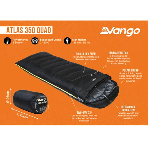 The Vango Atlas 350 Quad is perfect for festival-goers and those taking their first step into the world of camping. This 3 season sleeping bag, with its TOG rating of 9.5, soft Polair® fabric with single-layer stitch construction and shaped hood make it incredible value for money. The Vango Atlas 350 Quad is the perfect sleeping bag for a novice adventurers who want a cosy night’s sleep under the stars.