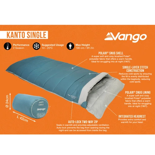 The Kanto Single offers you a wonderful cosy experience with its Polair® Snug brushed fabric and square design for those who like to be free to move inside the bag. Warmth is enhanced by the single layer construction which prevents cold spots and the integrated headrest, ensures heat is retained within the bag to keep you warm.