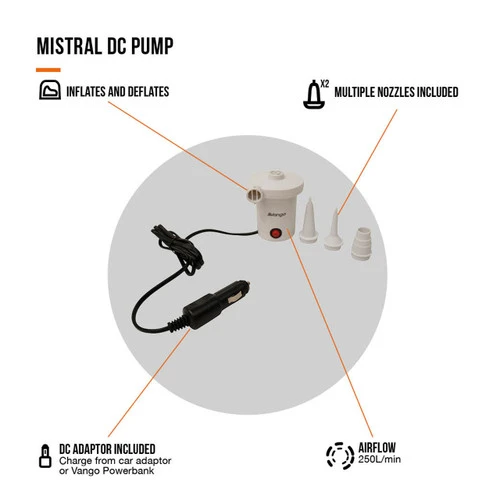 The Vango Mistral DC Pump makes inflating and deflating your airbed or inflatable furniture a breeze with a powerful airflow of 250L/minute. Ideal for the campsite, the electric pump includes multiple nozzle options. The Mistral is powered via DC car socket or a power bank